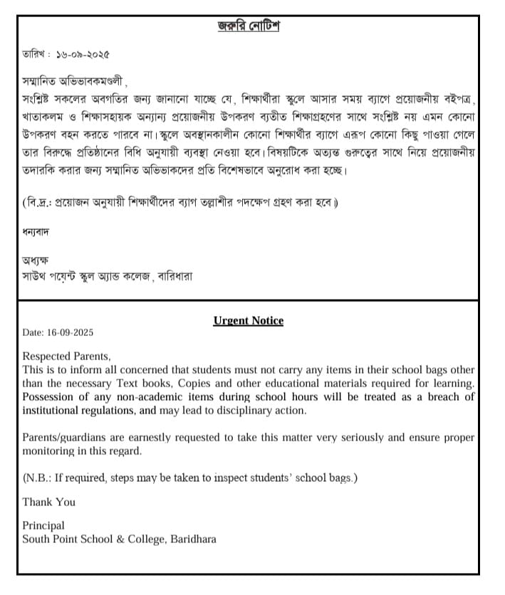 Admission Notice For Day Shift (Class: I - IV) 2026