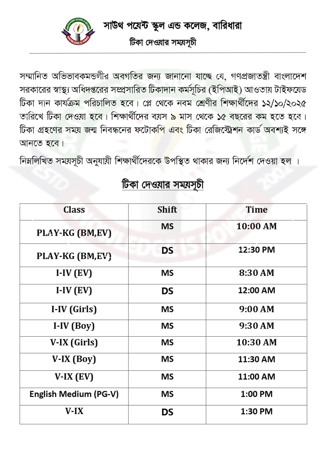 Admission Notice For Day Shift (Class: I - IV) 2026